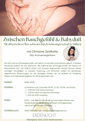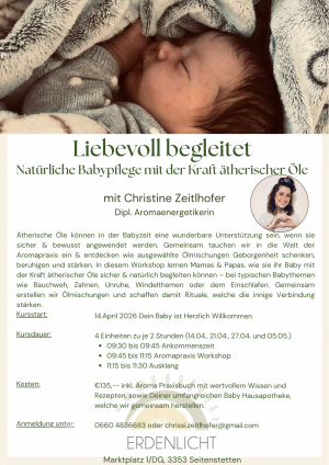 "Liebevoll begleitet - Natürliche Babypflege mit der Kraft ätherischer Öle" mit Christine Zeitlhofer             ab 14. April 2026, je 4 EH zu je 2 Stunden, jewei...