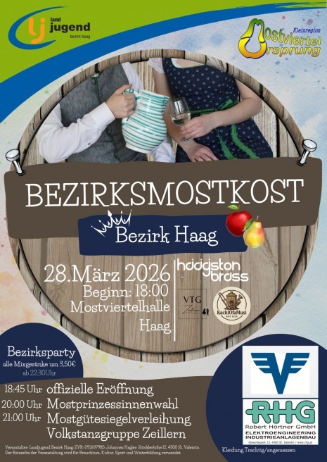 Am 28. März 2026 lädt die Landjugend Bezirk Haag in die Mostviertelhalle in Haag ein, zur Bezirksmostkost. Ab 18:00 Uhr erwartet euch ein Abend voller Genuss, Musik und echter Mostviertler Tradition.