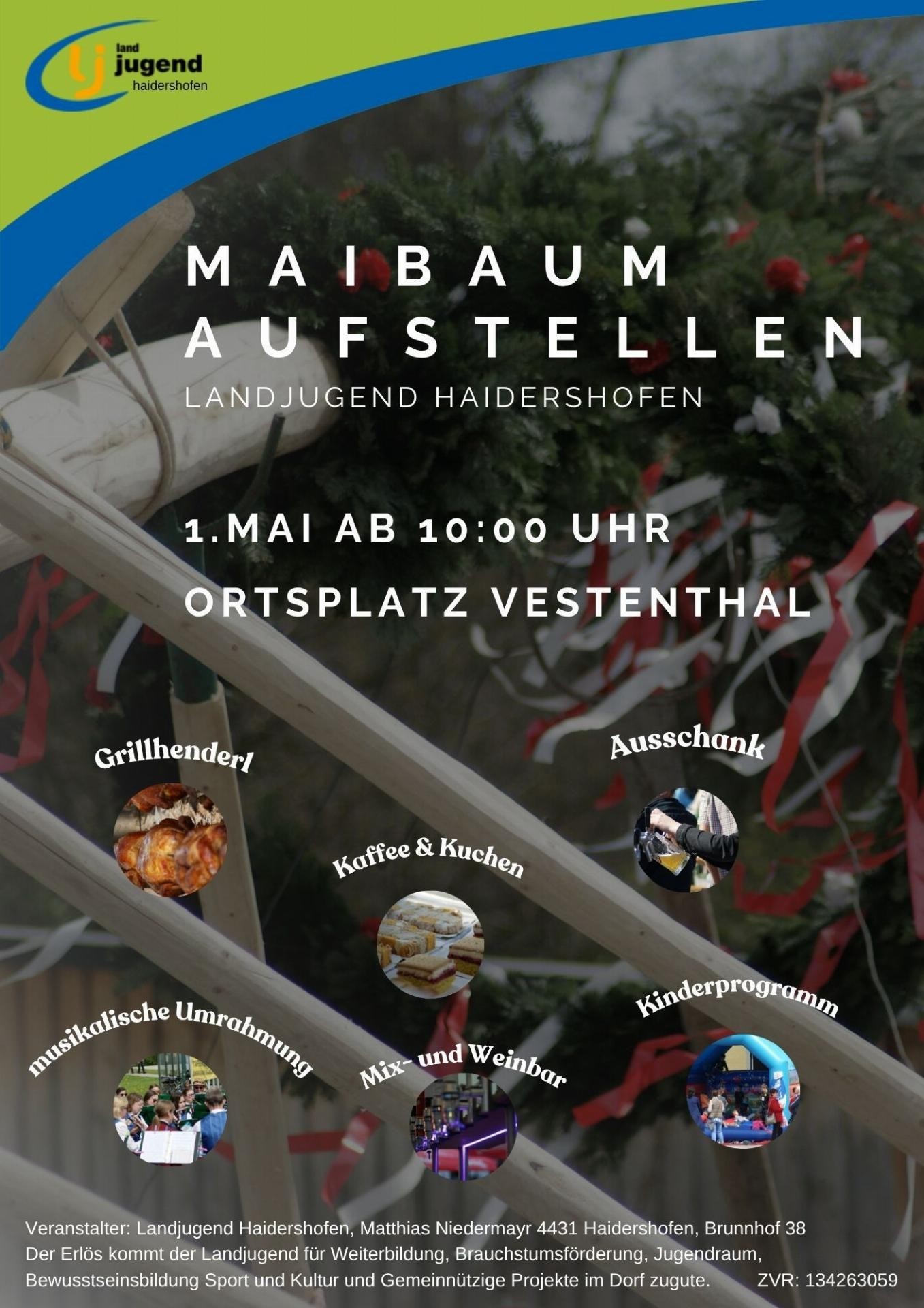 Wir, die Landjugend Haidershofen, laden Sie recht herzlich zum Maibaum aufstellen am 1. Mai am Ortsplatz in Vestenthal ein. Neben dem gemütlichen Zusammensitzen mit Freunden und Familie, kommt auch die musikalische Umrahmung und ein vielschichtiges Kinderprogramm nicht zu kurz. Wie jedes Jahr wird es außerdem eine Ausschank, Grillhendl, Kaffee und Kuchen sowie eine Wein- und Mixbar geben.