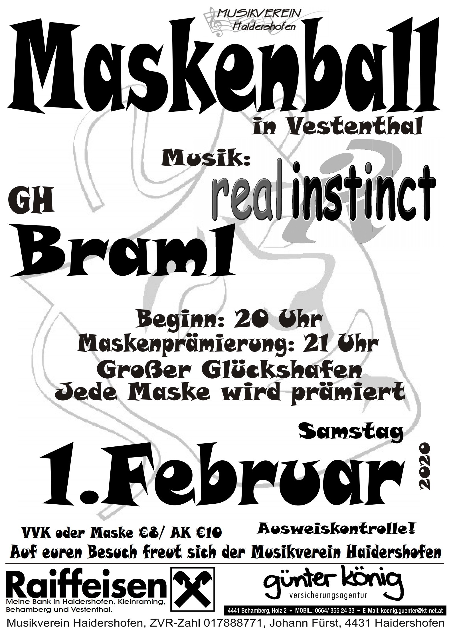 ►Einlass ab 19:00 Uhr - Beginn: 20:00 Uhr ►Musik: ♫♫♫♫♫ Real Instinct ♫♫♫♫♫ ►Maskenprämierung: 21 Uhr ►Großer Glückshafen ►Jede Maske wird prämiert ►VVK oder Maske €8/ AK €10 ►Ausweiskontrolle! Auf euren Besuch freut sich der Musikverein Haidershofen #MvHaiHoMaskenball des Musikvereins
