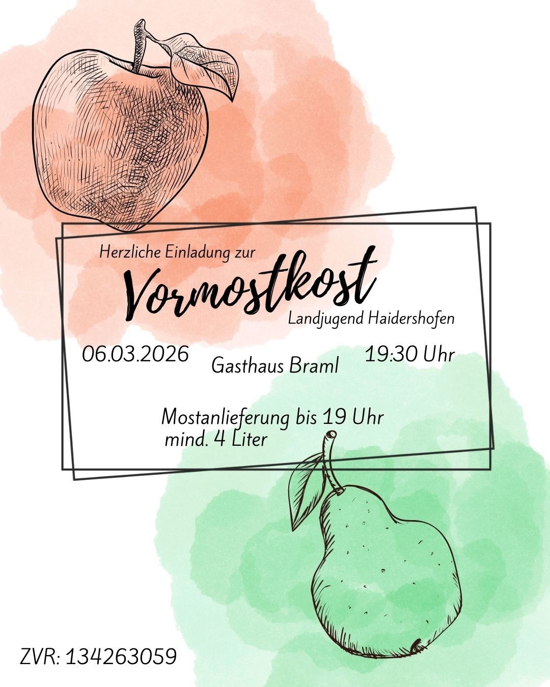 Die Landjugend Haidershofen lädt Sie recht herzlich zur Vormostkost im Gasthaus Braml ein. Beginn ist um 19:30 Uhr. Mostanlieferung bis 19 Uhr (mind. 4 Liter).