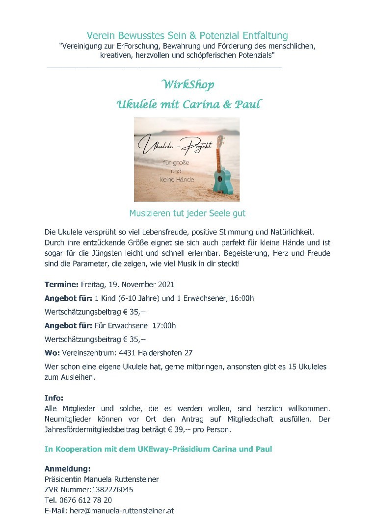 Wer schon eine eigene Ukulele hat, gerne mitbringen, ansonsten gibt es 15 Ukuleles zum Ausleihen.