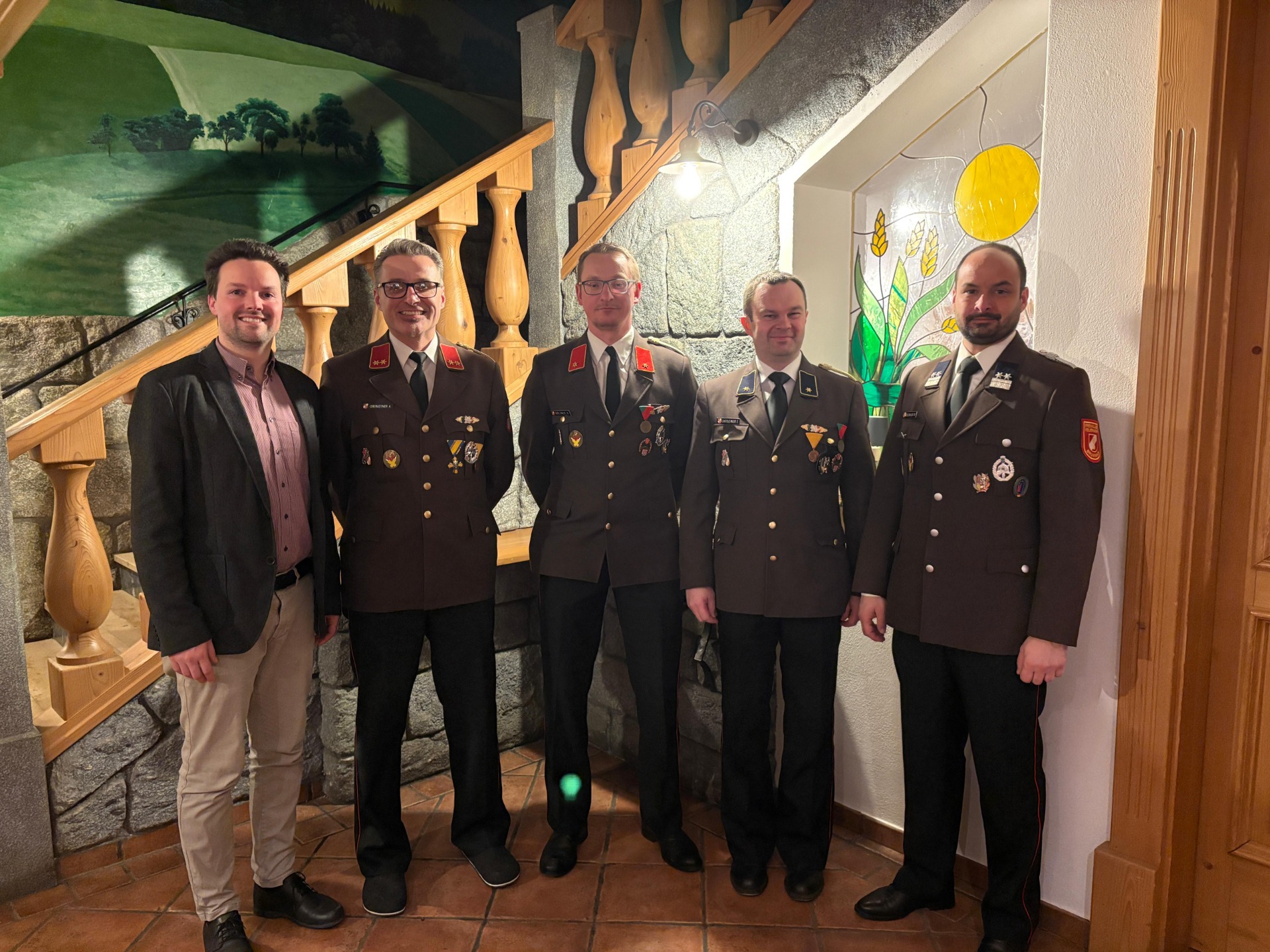 Bildtext v.l.n.r.: Bürgermeister Michael Strasser, Kommandant Andreas Oberleitner, Kommandant Stv. Andreas Gölzner, Franz Gartlehner und Matthias Buchinger komplettieren das Kommando der Freiwilligen Feuerwehr Brunnhof