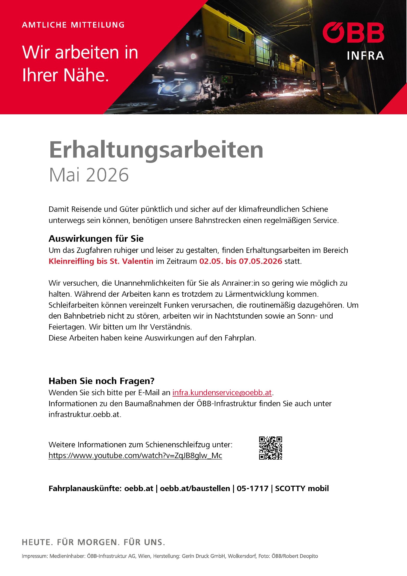 Um das Zugfahren ruhiger und leiser zu gestalten, finden Erhaltungsarbeiten im Bereich Kleinreifling bis St. Valentin im Zeitraum 02.05. bis 07.05.2026 statt.