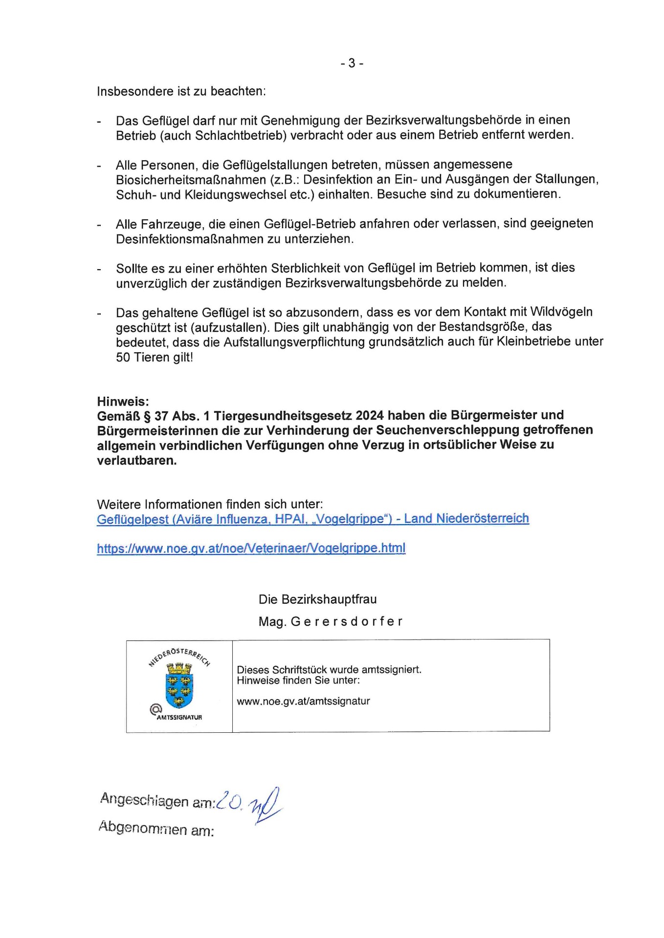 Die Bezirkshauptmannschaft Amstetten informiert gemäß § 37 Tiergesundheitsgesetz 2024, dass im Magistrat Steyr, Oberösterreich, der Ausbruch der Hochpathogenen Aviären Influenza (Geflügelpest, Vogelgrippe) festgestellt worden ist.