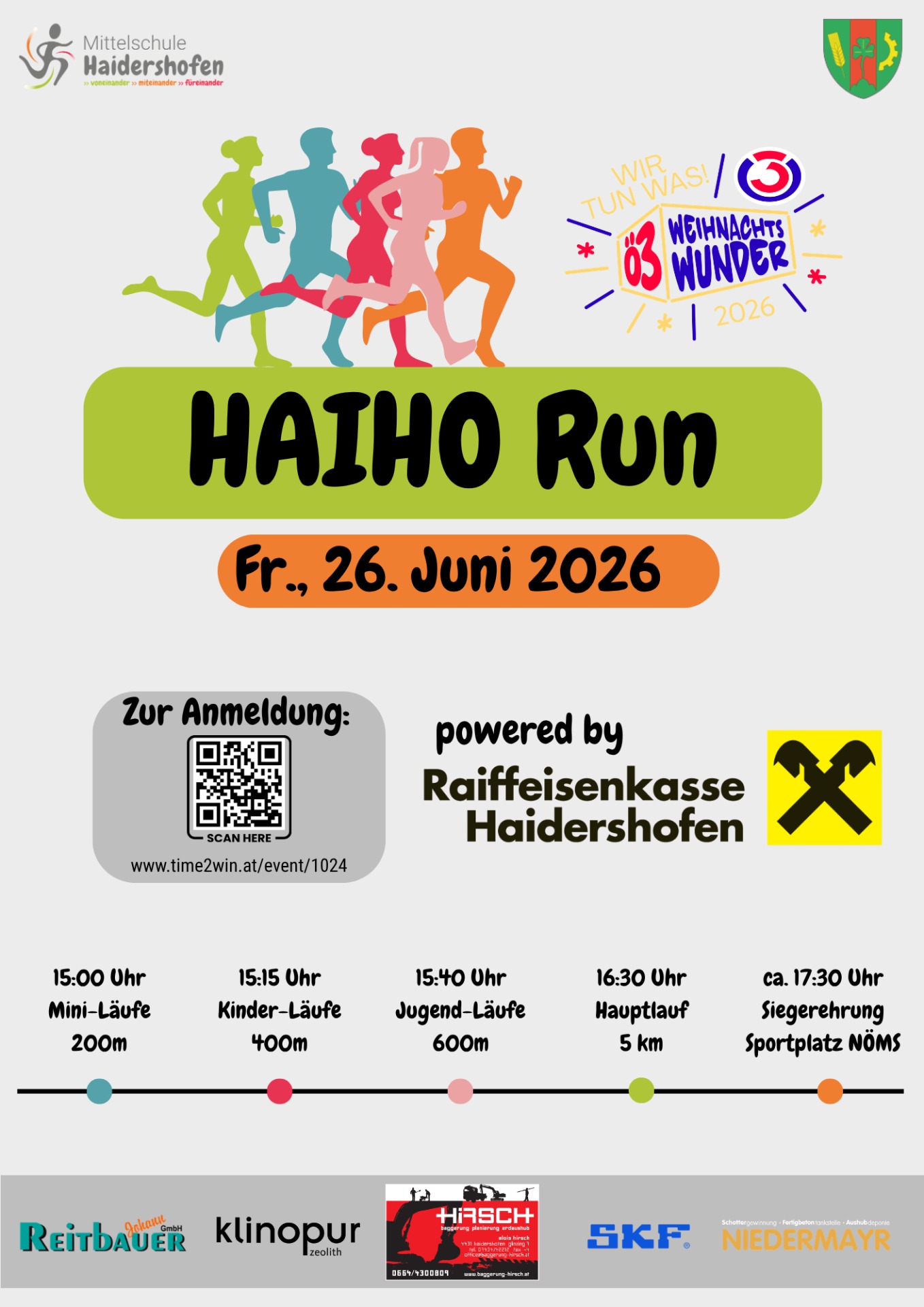 Schülerinnen und Schüler der Schwerpunktgruppe „Bewegung und gesunde Ernährung“ der NÖMS Haidershofen rufen den beliebten „Haidershofner Ortslauf“ in frischem Glanz erneut ins Leben! Ein sportliches Highlight für den guten Zweck - die gesamten Nenngeld-Beträge werden an das Ö3-Weihnachtswunder gespendet.