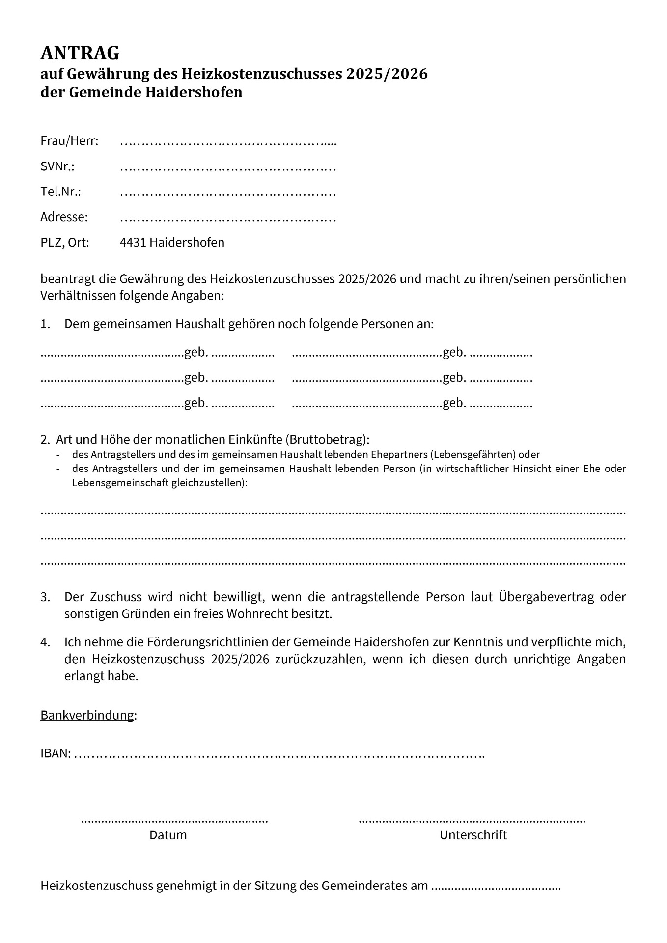 Gemäß den Richtlinien des Heizkostenzuschusses des Landes Niederösterreich 2025/26 beteiligt sich auch die Gemeinde Haidershofen wieder an der Aktion. Die Gemeinde Haidershofen gewährt einen zusätzlichen Zuschuss von 150,00 Euro.