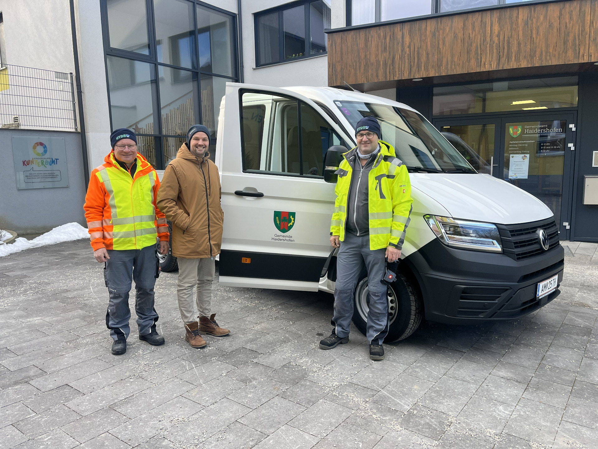 Die Gemeinde Haidershofen hat in der vergangenen Woche einen neuen Pritschenwagen für ihren Bauhof in Betrieb genommen. Nach 20 Jahren und einer Laufleistung von rund 238.000 Kilometern wurde der alte VW Transporter durch einen modernen VW Crafter ersetzt. Diese notwendige Investition von rund 50.000 Euro wurde notwendig, da eine Reparatur im Hinblick auf die §57a