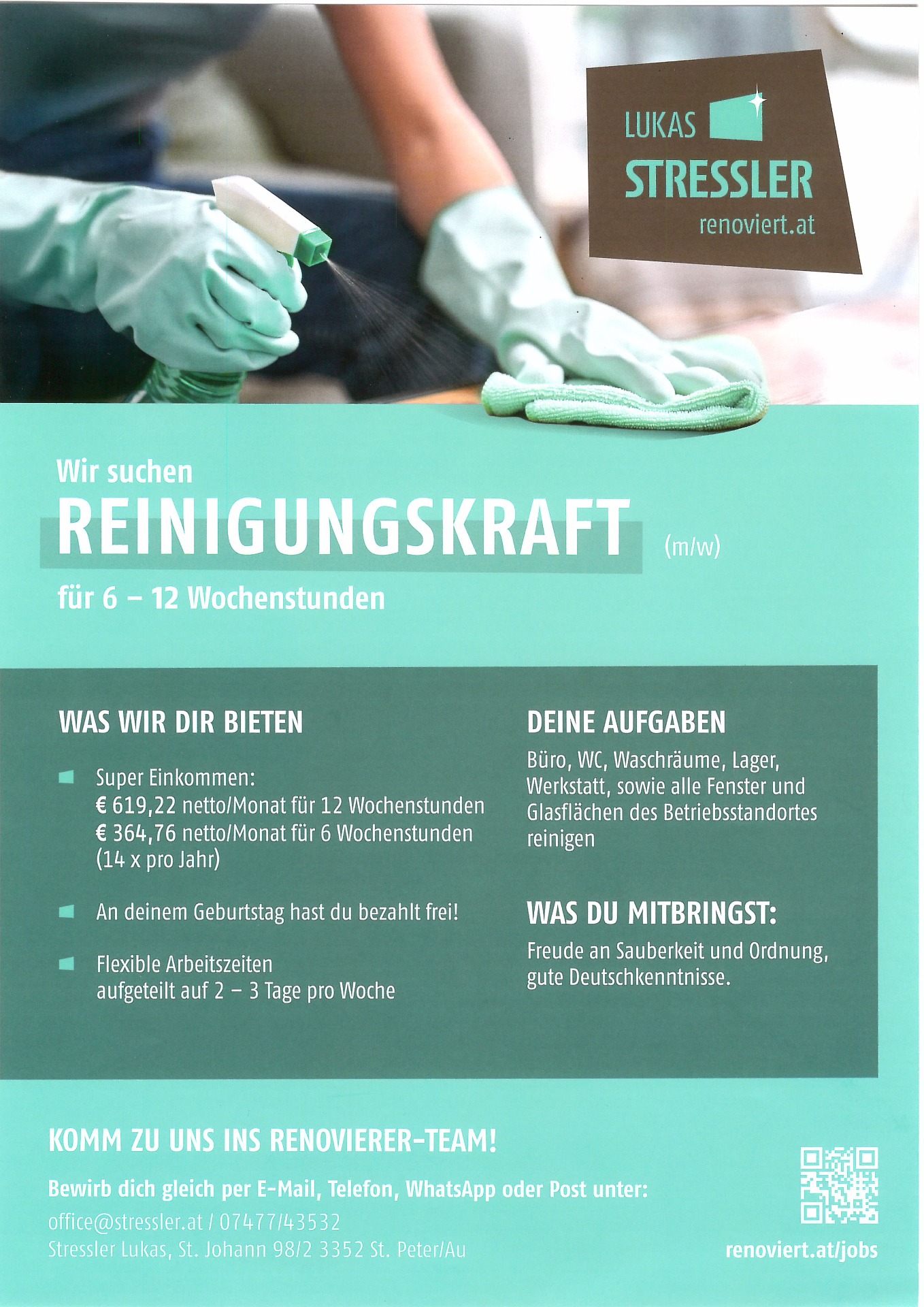 Die Fa. Lukas Stressler in St. Peter/Au sucht eine Reinigungskraft (m/w) für 6 - 12 Wochenstunden.