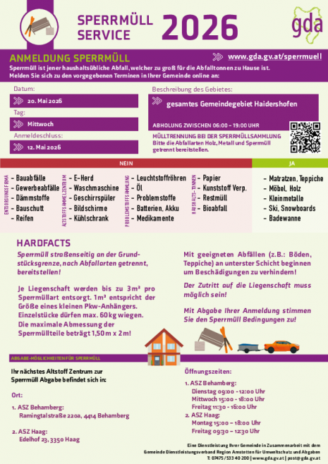 In den kommenden Wochen findet in der Gemeinde Haidershofen wieder die jährliche Splittkehrung statt. Um die Kehrarbeiten rasch und reibungslos durchführen zu können, ersuchen wir alle Gemeindebü...