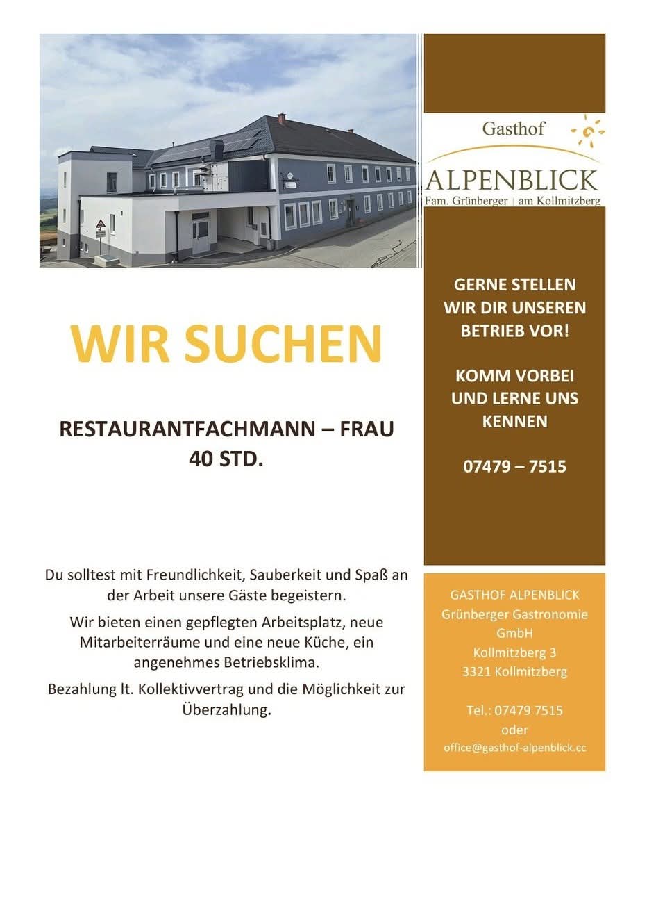 Restaurantfachmann-Frau 40 Std. /Gasthof Alpenblick in Kollmitzberg